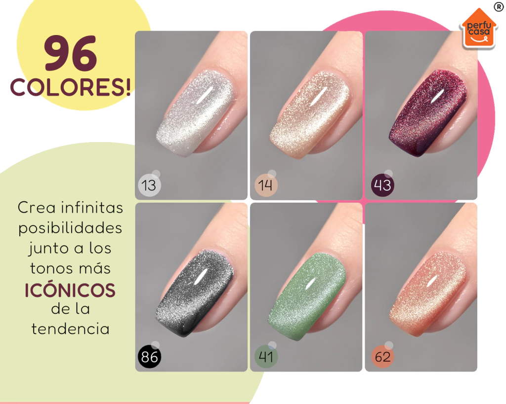 Ademas de conseguir 12 esmaltes Cat Eye, el kit incluye un imán especialmente diseñado que realza el efecto ojo de gato, dándole profundidad y un brillo excepcional a tus uñas. Su textura suave facilita una cobertura uniforme y duradera, ideal para quienes buscan un acabado elegante y lleno de estilo.