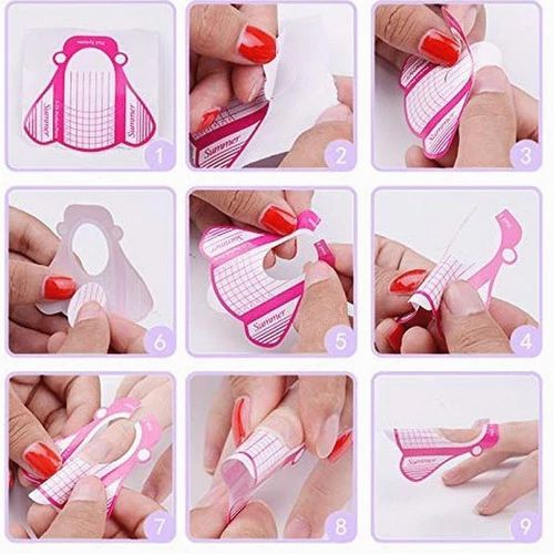 Cómo usar: Tome un pedazo de soporte de papel debajo de la uña, pegue las dos esquinas juntas, mantenga una curvatura perfecta y haga una uña de cristal o gel sobre ella. Puede decidir la uña que desea hacer de acuerdo con la escala anterior. La longitud y el diseño conveniente facilitan el control de la longitud de cada clavo de cristal.